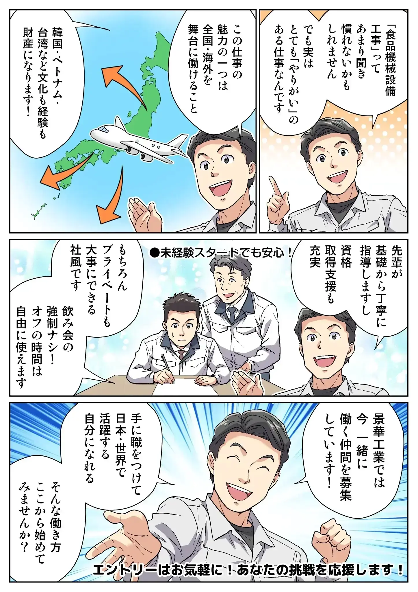 食品機械設備の組立・電気・整備工事など、精度と衛生管理が求められる現場が多数。安全第一の姿勢と、見た目まで美しく仕上げる品質基準により、どこに出ても通用する職人技が身に付きます。